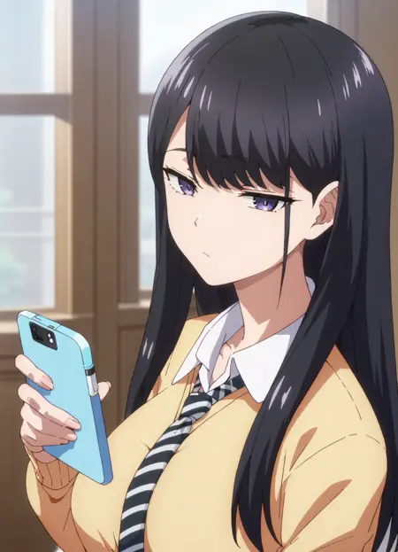 - Amakami Honpo,黑发,长发,紫色眼睛,刘海 / 书包,校服,百褶裙,有领衬衫,围巾,