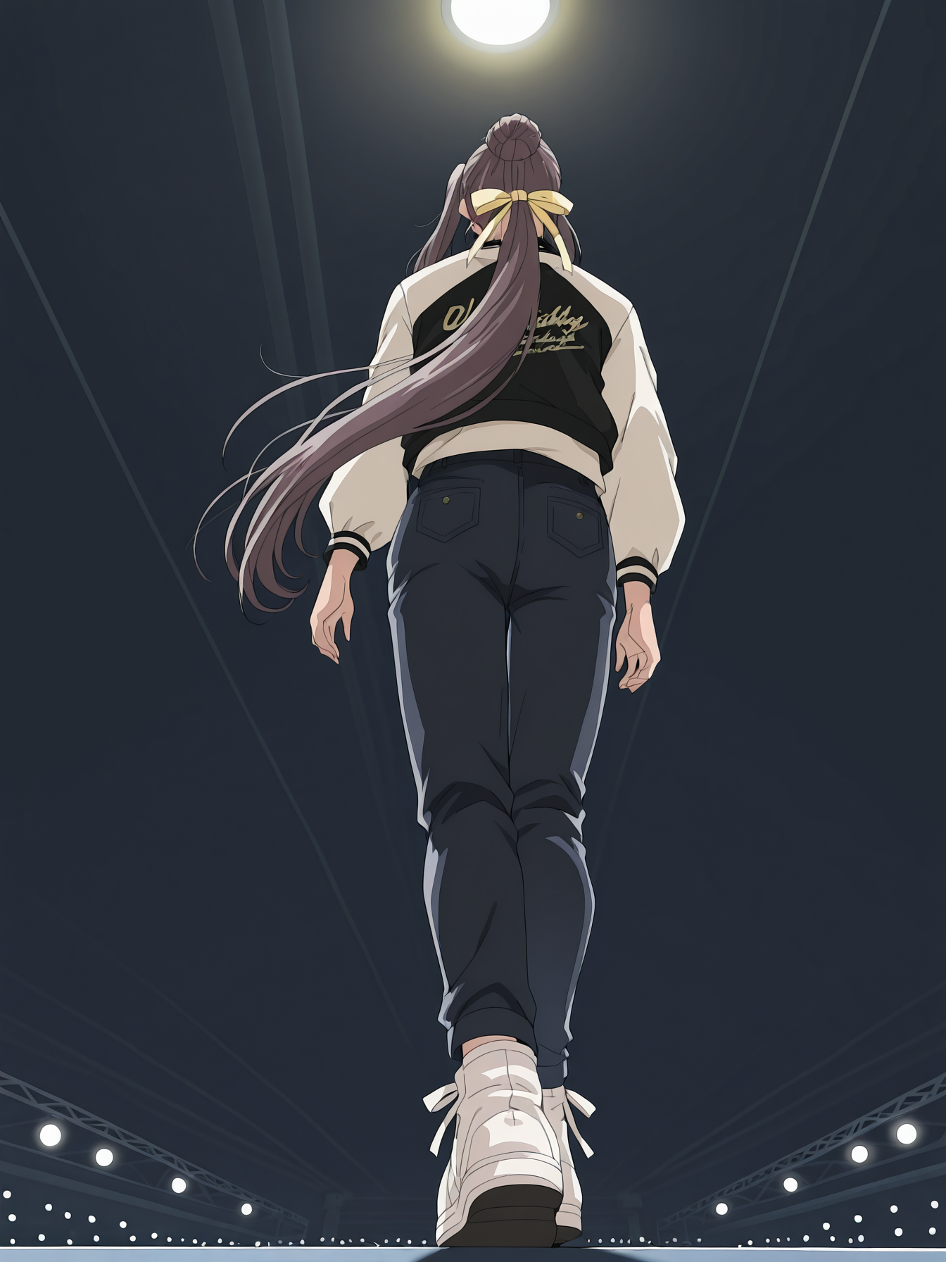 miyanoshita、編み込みポニーテール、レターマンジャケット、青いスカート
