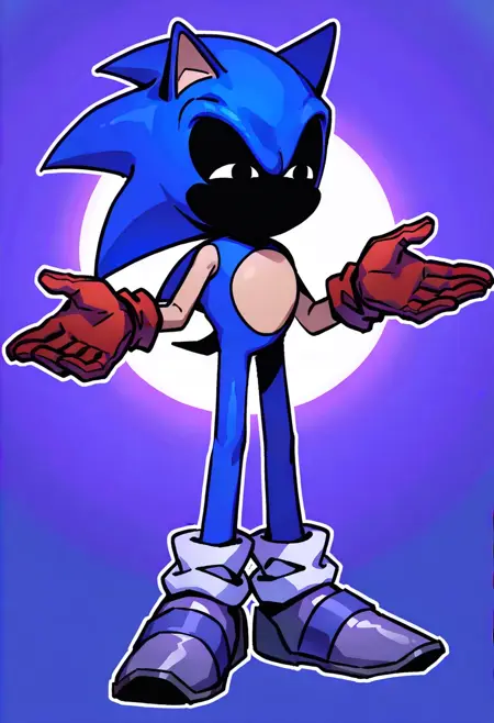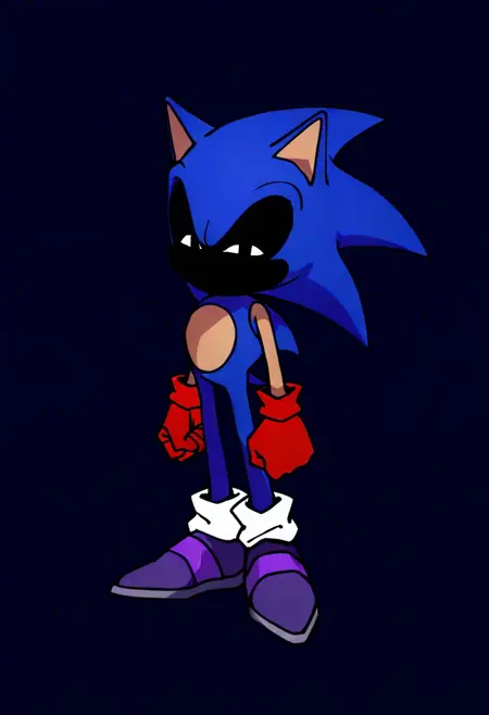 XTerionEXE, 1boy, dark blue fur, silhouetted face, hollow face, black eyes, mouthless, tan bit of chest fur, red gloves, gray and purple sneakers, sonic the hedgehog,