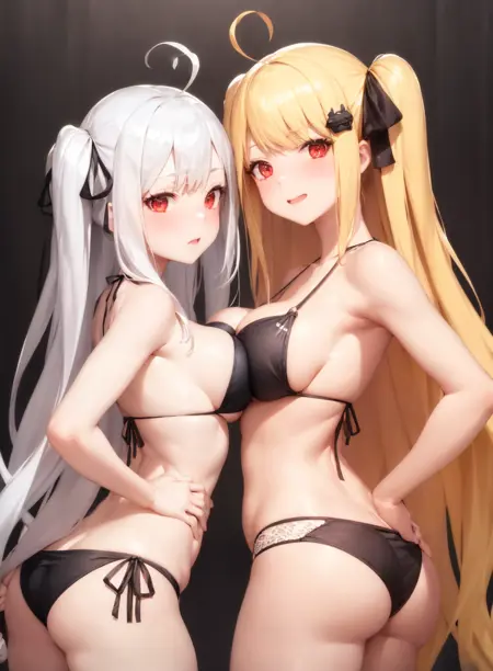 Asaba: 1girl, blonde hair, long hair, ribbon, red eyes, two side up, hair ribbon, hair ornament, black ribbon, ahoge, very long hair, bangs,. add medium breast if u want