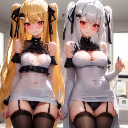 Mio:1girl, white hair, long hair, ribbon, red eyes, two side up, hair ribbon, hair ornament, black ribbon, ahoge, very long hair, bangs,. add large breast if u want