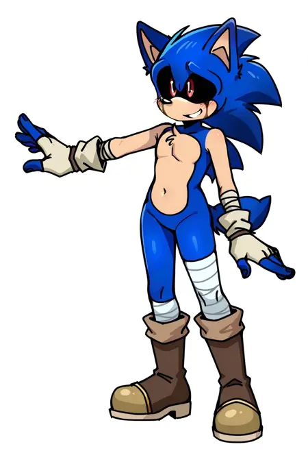 CurseFNF, 1boy, lanky version of Sonic, darker blue fur, white fingerless gloves, bandages on legs, brown and tan boots, red eyes, black sclera