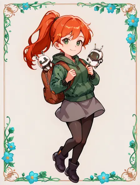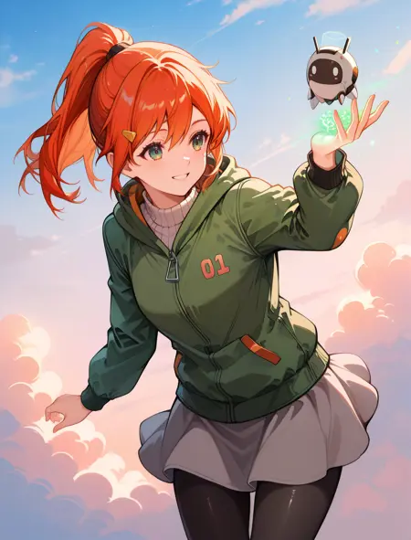 green eyes, ponytail, long hair, orange eyes, glasses