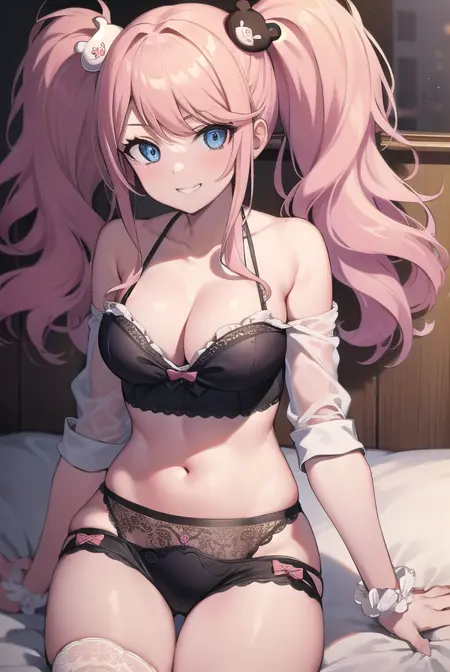 江之岛盾子,熊形发饰,蓝眼睛,长发,粉发,双马尾,波浪发