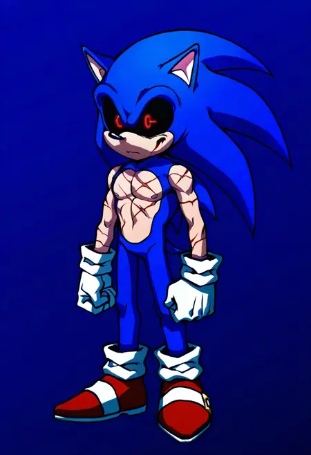 NostalgiaEXE, 1boy, Hedgehog, dark blue fur, softer arms, black eyes, small reddish glowing pupils, black sclera, colored sclera, white gloves, red shoes, two tone fur, horror, scars on chest,