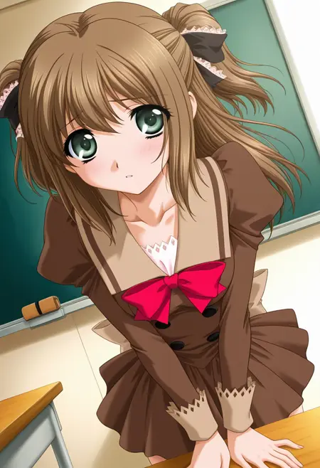 触发词: c lip, long hair, brown hair, green eyes, hair ribbon,