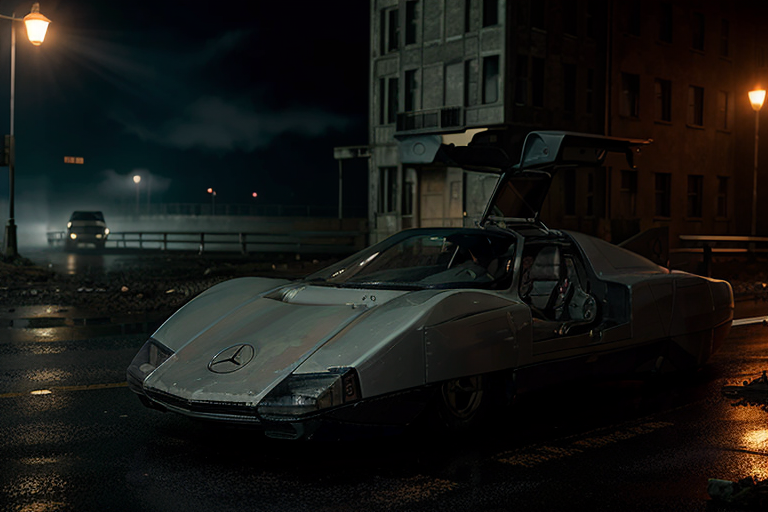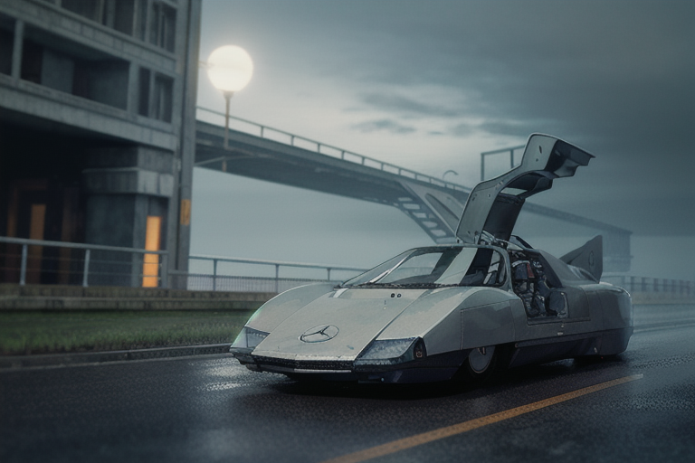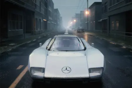 With the success of the C111 and it’s sparsely modified C 111-II first displayed at the Geneva Motor Show, developers took the C111 to new heights. This time, they did not create a design study for a road-going sports car but a thoroughbred racing car for the sole purpose of establishing speed records: the C 111-III. The new car was built in 1977; it was narrower than the first C 111, had a longer wheelbase and good aerodynamic properties, thanks to complete streamlining and rear airfoils. In 1978, the C 111-III lined up at the start in Nardo.