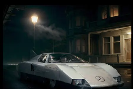 A diesel engine growled under the silver-painted plastic bodywork. While this engine had been derived from a production unit, it had been tuned to develop 230 hp and gave the streamlined car a top speed well over 300 km/h. With this Silver Arrow, Mercedes-Benz established nine world records in the late 1970s.