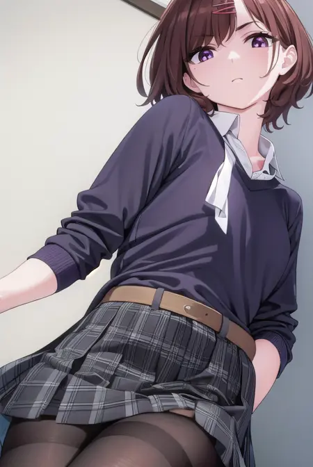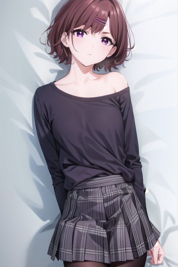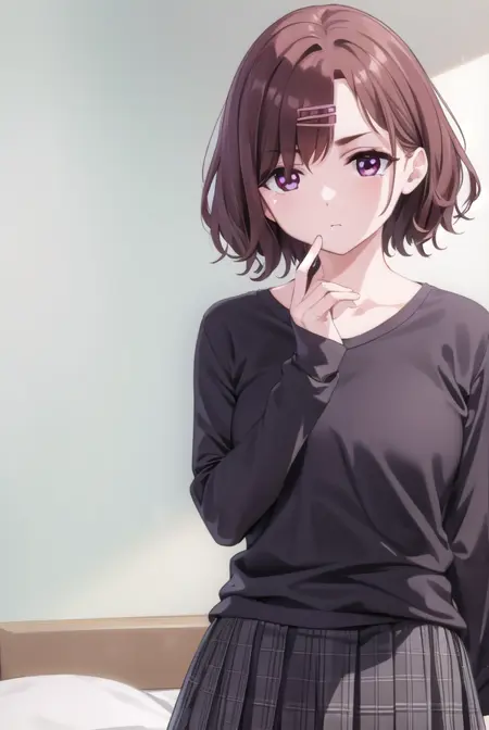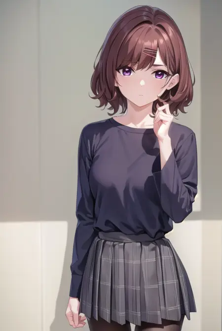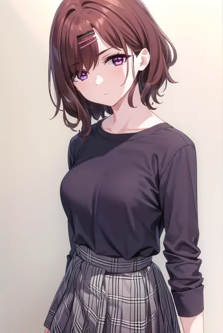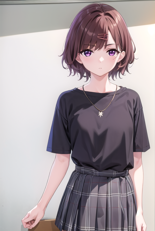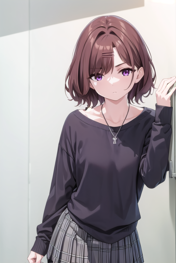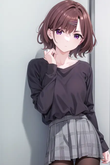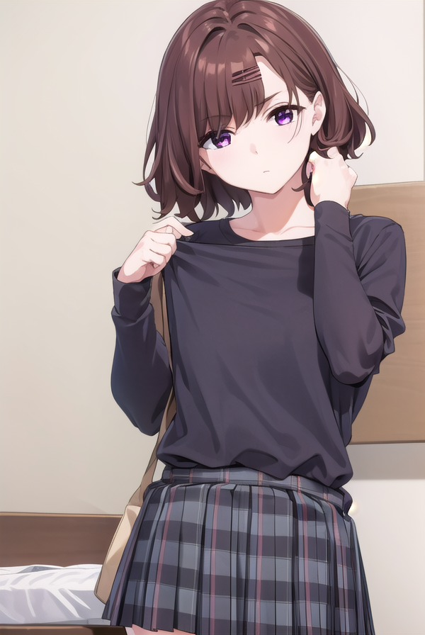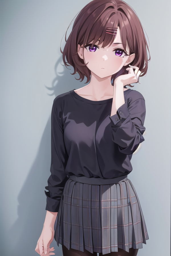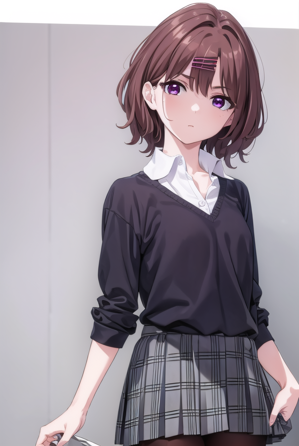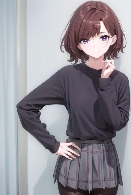 마도카 히구치, 갈색 머리카락, 머리카락에 가려진 눈썹, 회색 배경, 머리 장신구, 헤어클립, 두더지, 눈 밑 두더지, (보라색 눈:1.1), 단발, 물결 모양 머리카락,