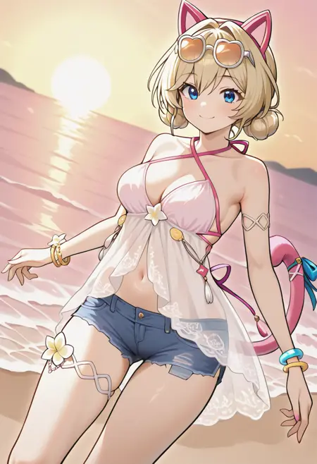 michele_rhythm,1girl,solo,blonde hair,double bun,short hair,blue eyes,cat tail,tail ornament,fake animal ears,cat ears,blue shorts,denim shorts,short shorts,eyewear on head,sunglasses,jewelry,bracelet,flip-flops,swimsuit,bare shoulders,see-through dress,criss-cross halter,halterneck,thigh flower strap,