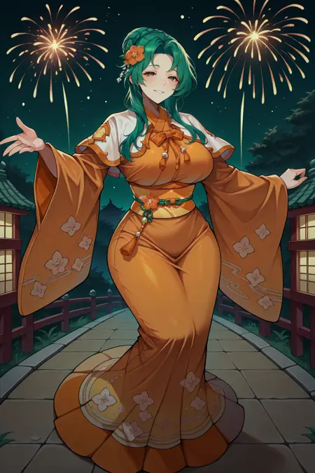 호시단 서머 엘린시아를 원하면 "hsElincia, green hair, hair bun, long hair, braid, brown eyes, hair flower, hat, white capelet, orange kimono, sash, wide sleeves, floral print"를 추가하세요.