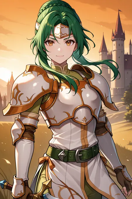 파이어 엠블렘 히로즈 기본 외모를 원하면 "dfElincia, green hair, hair bun, long hair, braid, brown eyes, white headband, white armor, shoulder armor, breastplate, white tunic, green belt, elbow gloves, fingerless gloves, white boots, thigh boots"를 추가하세요.