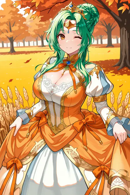 • Add "ogElincia, green hair, hair bun, long hair, braid, brown eyes, forehead jewelry, earrings, collarbone, orange dress, puffy sleeves, long sleeves, yellow skirt, large breasts" for her original appearance.