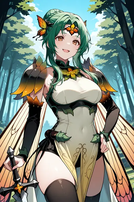 레스플렌던트 엘린시아를 원하면 "rsElincia, green hair, hair bun, long hair, braid, brown eyes, black circlet, insect wings, shoulder pads, sleeveless dress, detached sleeves, black sleeves, pelvic curtain, black thighhighs"를 추가하세요.