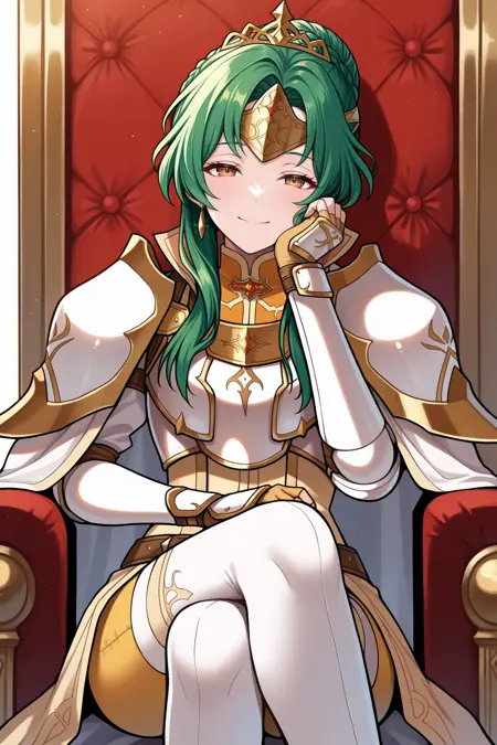 레전더리 엘린시아를 원하면 "lgdElincia, green hair, hair bun, long hair, braid, brown eyes, gold tiara, crown, earrings, white cape, armored dress, white armor, gold trim, yellow pants, fingerless gloves, white thighhighs"를 추가하세요.