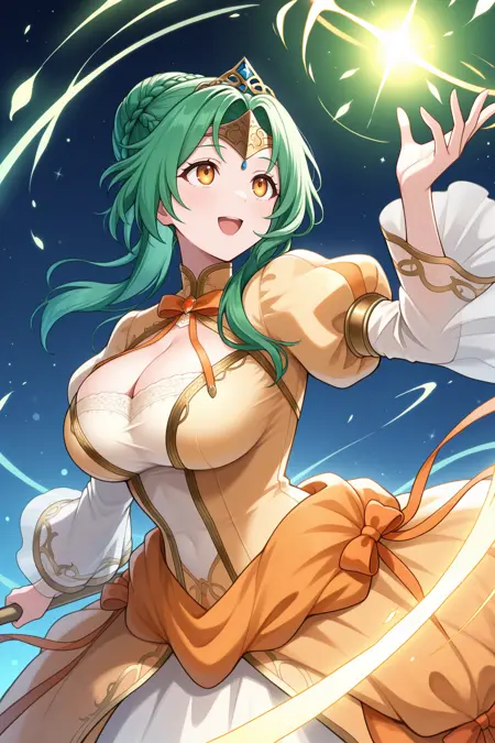 어센디드 엘린시아를 원하면 "ascElincia, green hair, hair bun, long hair, braid, brown eyes, tiara, white and orange ballgown, gold trim, ribbon, cleavage, long dress, puffy sleeves, long sleeves"를 추가하세요.