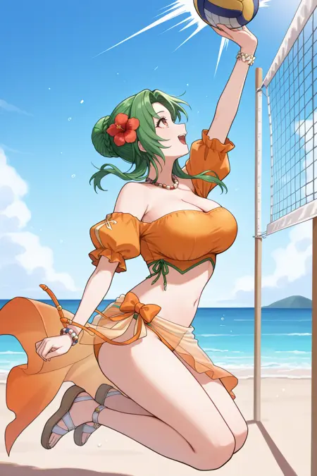 서머 엘린시아를 원하면 "smrElincia, green hair, hair bun, long hair, braid, brown eyes, red flower, beads, bead necklace, bead bracelet, hair flower, off-shoulder bikini, orange bikini, puffy sleeves, cleavage, stomach, sarong, swimsuit"를 추가하세요.