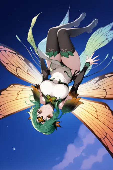 • Add "rsElincia, green hair, hair bun, long hair, braid, brown eyes, black circlet, insect wings, shoulder pads, sleeveless dress, detached sleeves, black sleeves, pelvic curtain, black thighhighs" for Resplendent Elincia.