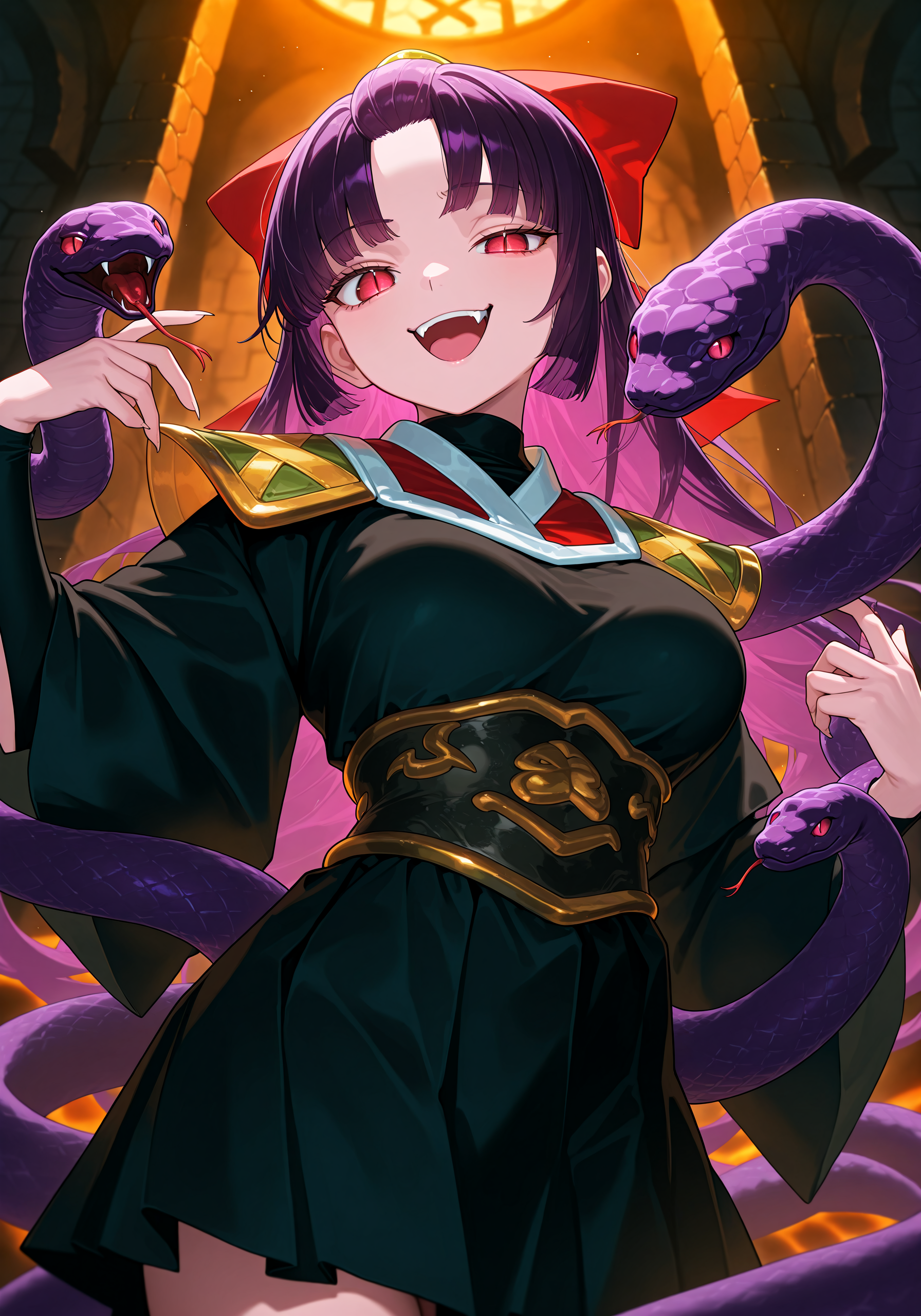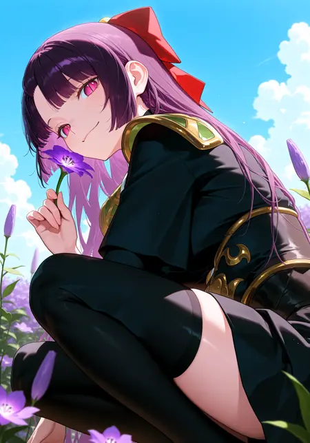 - black dress, green shoulder guards, waist corset, skirt, thighhighs
