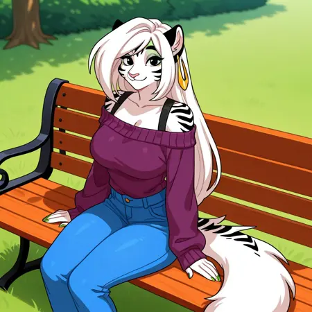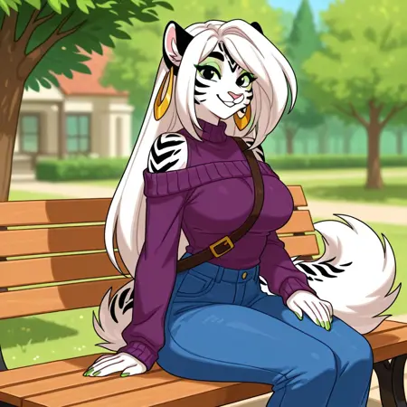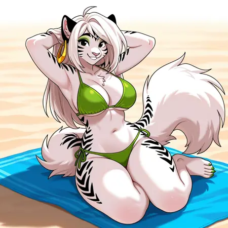 catgirl, tiger, female furry, white and black fur, striped fur, bushy tail, white hair, long hair, black ears, black eyes, green eyeshadow, green nail polish, large breasts, gold hoop earrings,
