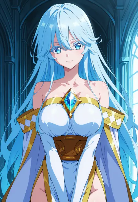 ベース:elfaria, 1girl, アニメ調カラーリング, レトロなアートスタイル, シングル, 長い髪, 非常に長い髪, 青白い髪, 色付きまつげ, 青い目, elfariaの白いドレス, レースレスドレス, 宝石, 肩を露出, 外れ袖, fariaの帯, 骨盤カーテン, レースのマント, 婚礼用手袋,