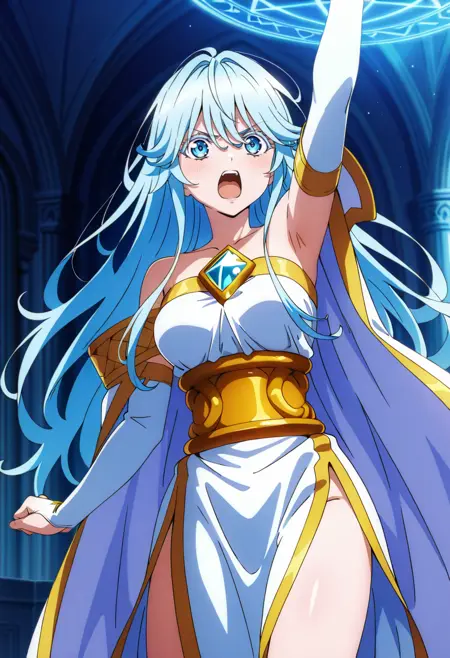 베이스: elfaria, 1girl, 애니메이션 색감, 레트로 아트스タイル, 싱글, 긴 머리, 매우 긴 머리, 푸른 하얀 머리, 색상이 있는 속눈썹, 파란 눈, elfaria 흰 드레스, 스트랩리스 드레스, 보석, 어깨 노출, 분리된 소매, faria 머리띠, 골반 커튼, 망토, 신부 장갑,