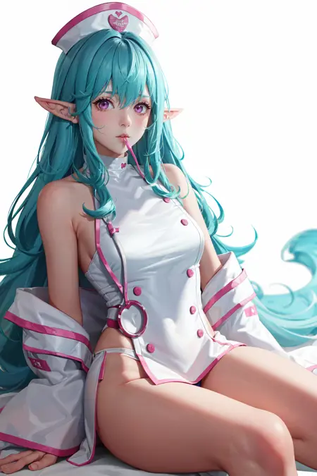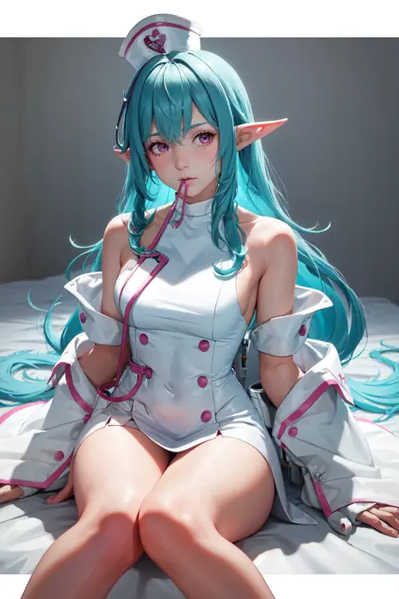 Prompt: ((big breasts)), 1girl, solo, long hair, looking at viewer, smile, hat, hair between eyes, very long hair, blue hair, upper body, pink hair, heart, detached sleeves, pointy ears, artist name, pink eyes, streaked hair, nurse cap, nurse, some pink hair