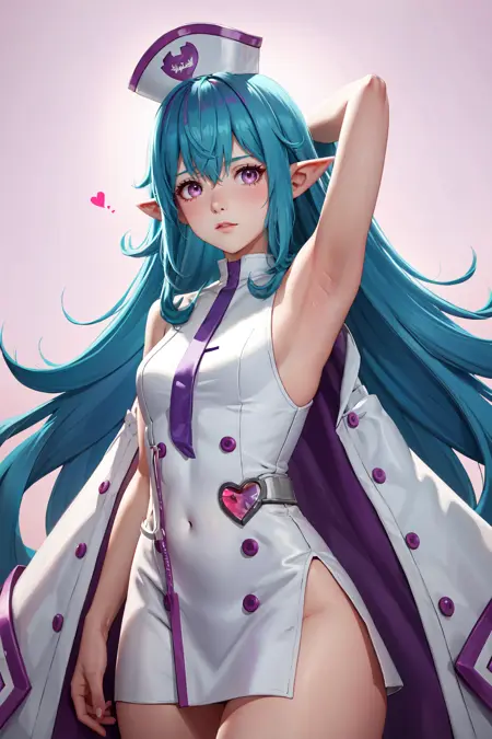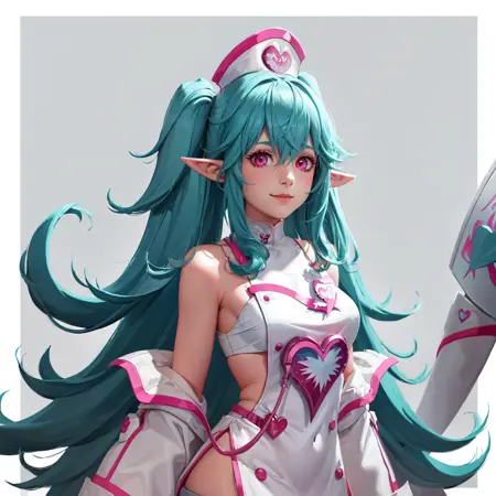 提示:((大乳房)),1个女孩,单独,长发,看着观众,微笑,帽子,头发在眼睛之间,非常长的头发,蓝色头发,上半身,粉红色头发,心形,袖子分离,尖耳朵,艺术家名字,粉红色眼睛,渐变色头发,护士帽,护士,一些粉红色头发