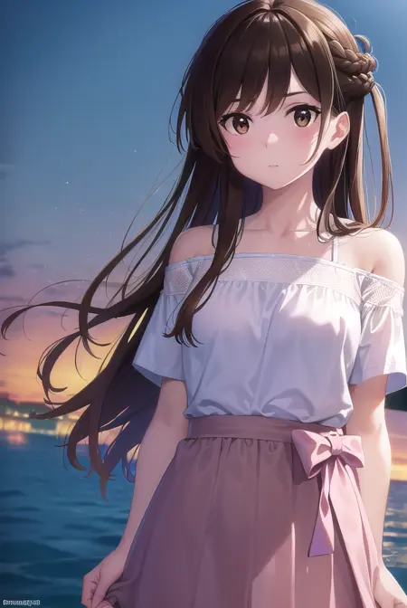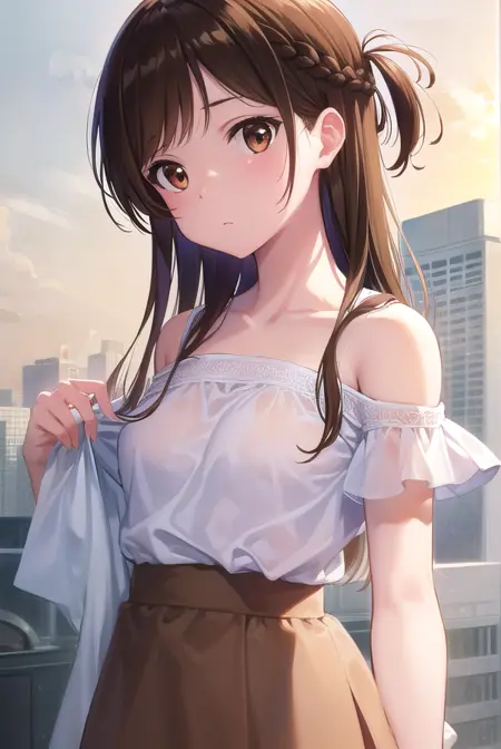 mizuhara chizuru, (brown eyes:1.5), brown hair, long hair, (one side up:1.5),